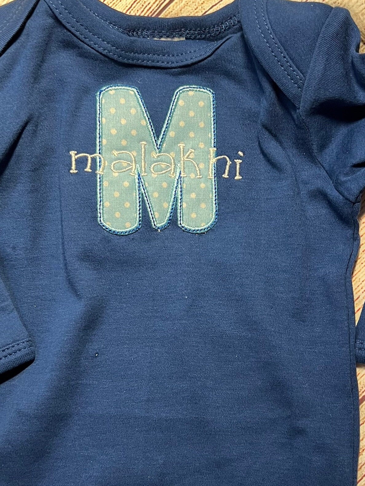 Baby gown with baby’s First name over monogramed 3” initial appliqué in a coordinated fabric to match.