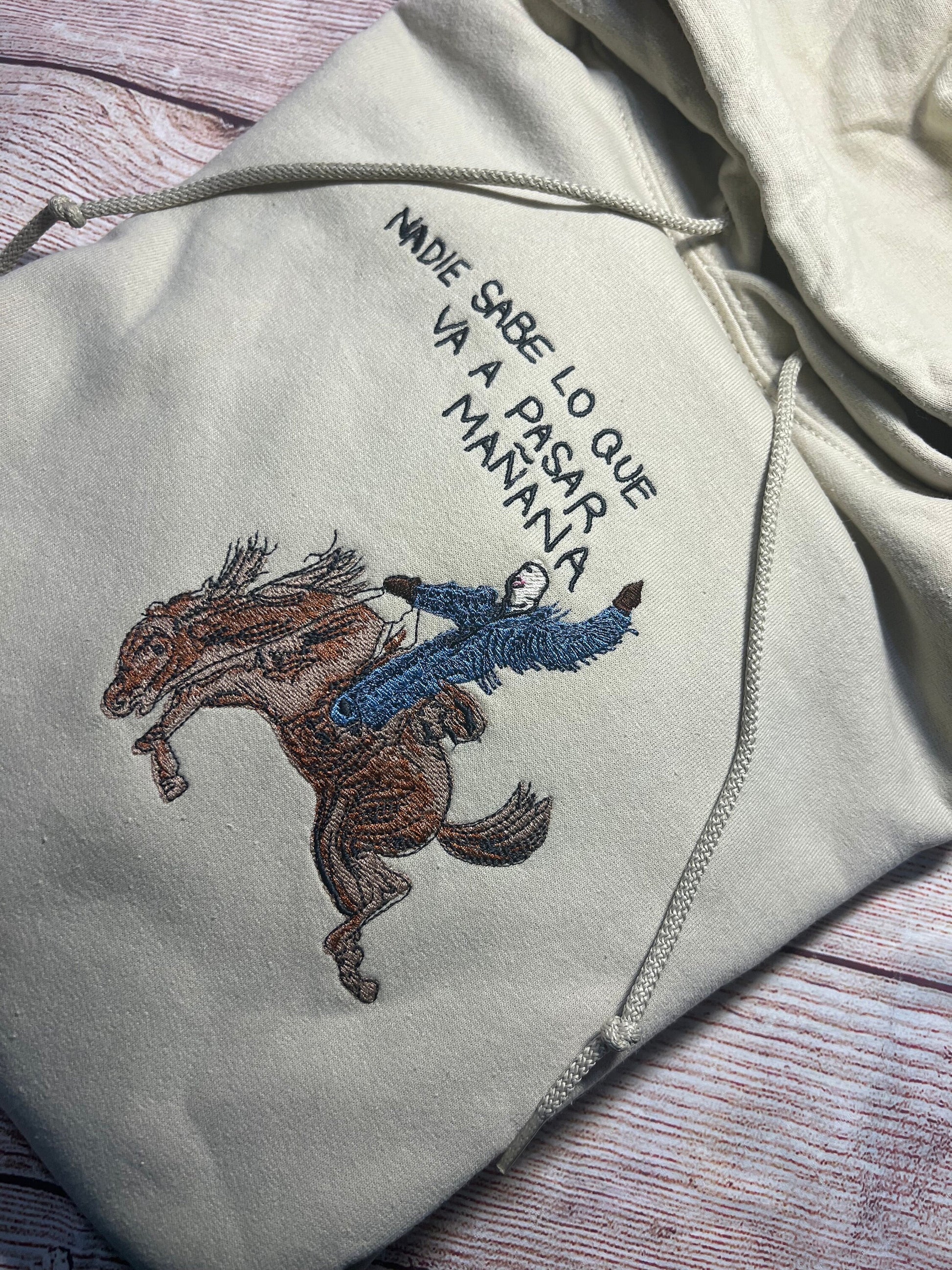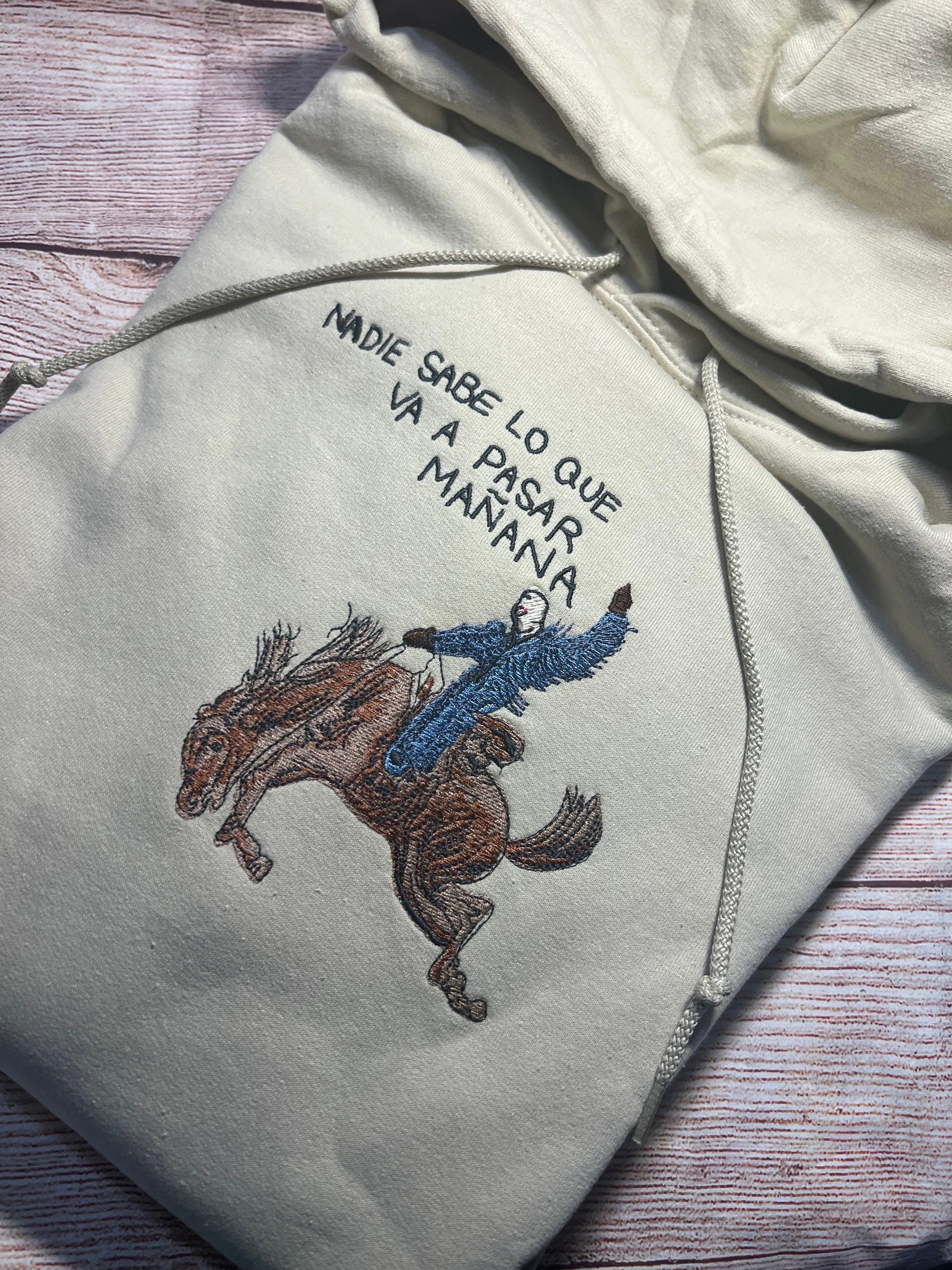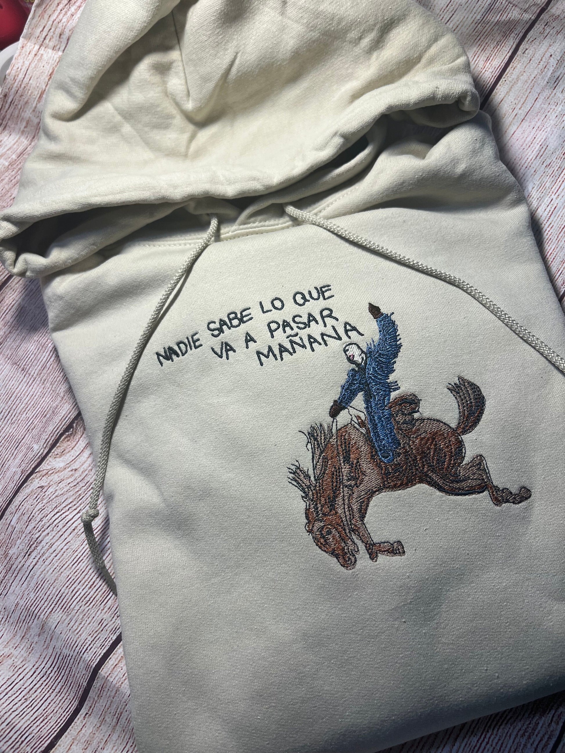 Bad Bunny Nadie Sabe Lo Que Va Pasar Mañana embroidered hoodie. Long sleeve, beige, cotton hoodie. Made to order. size chart in photos.