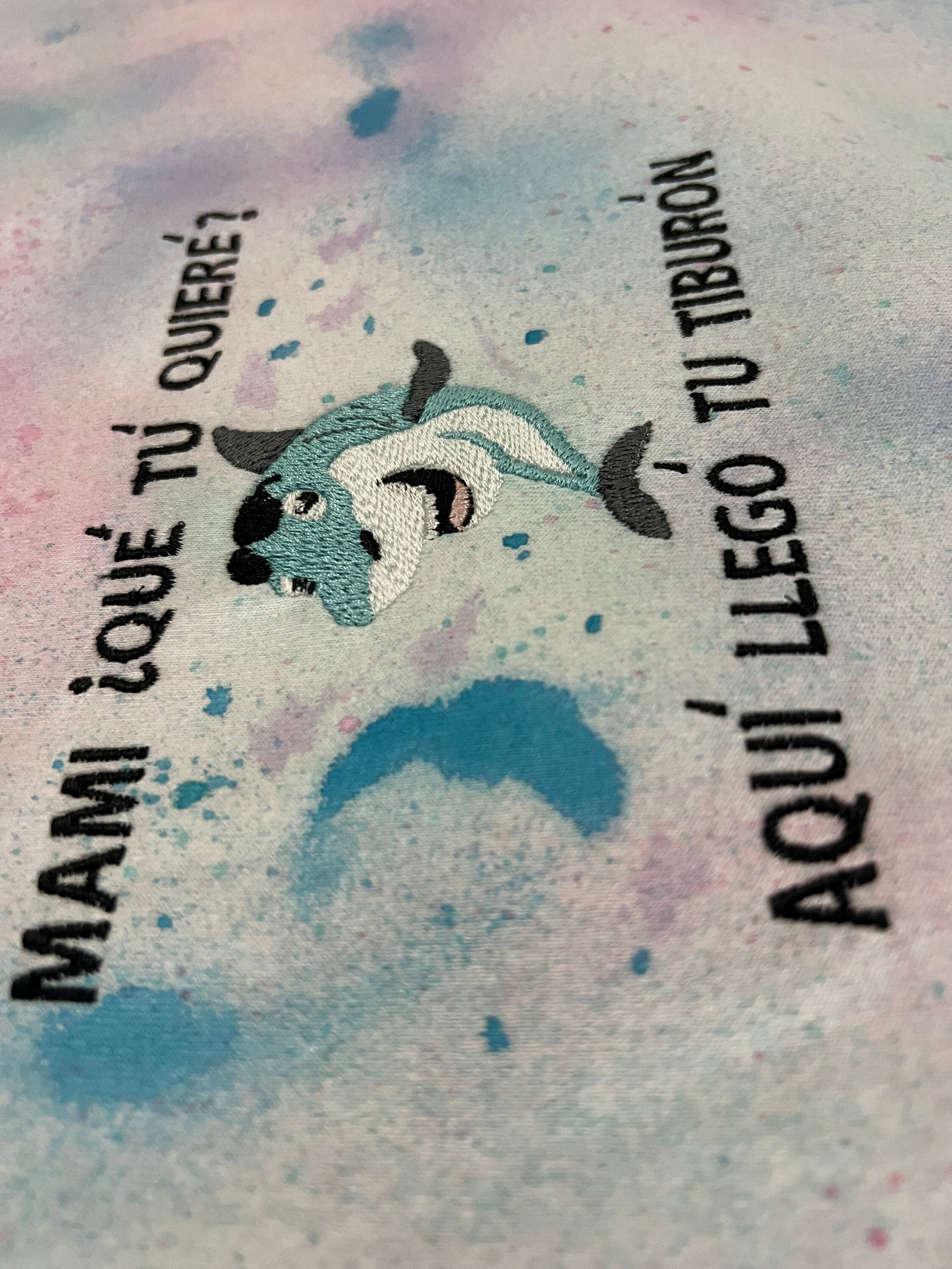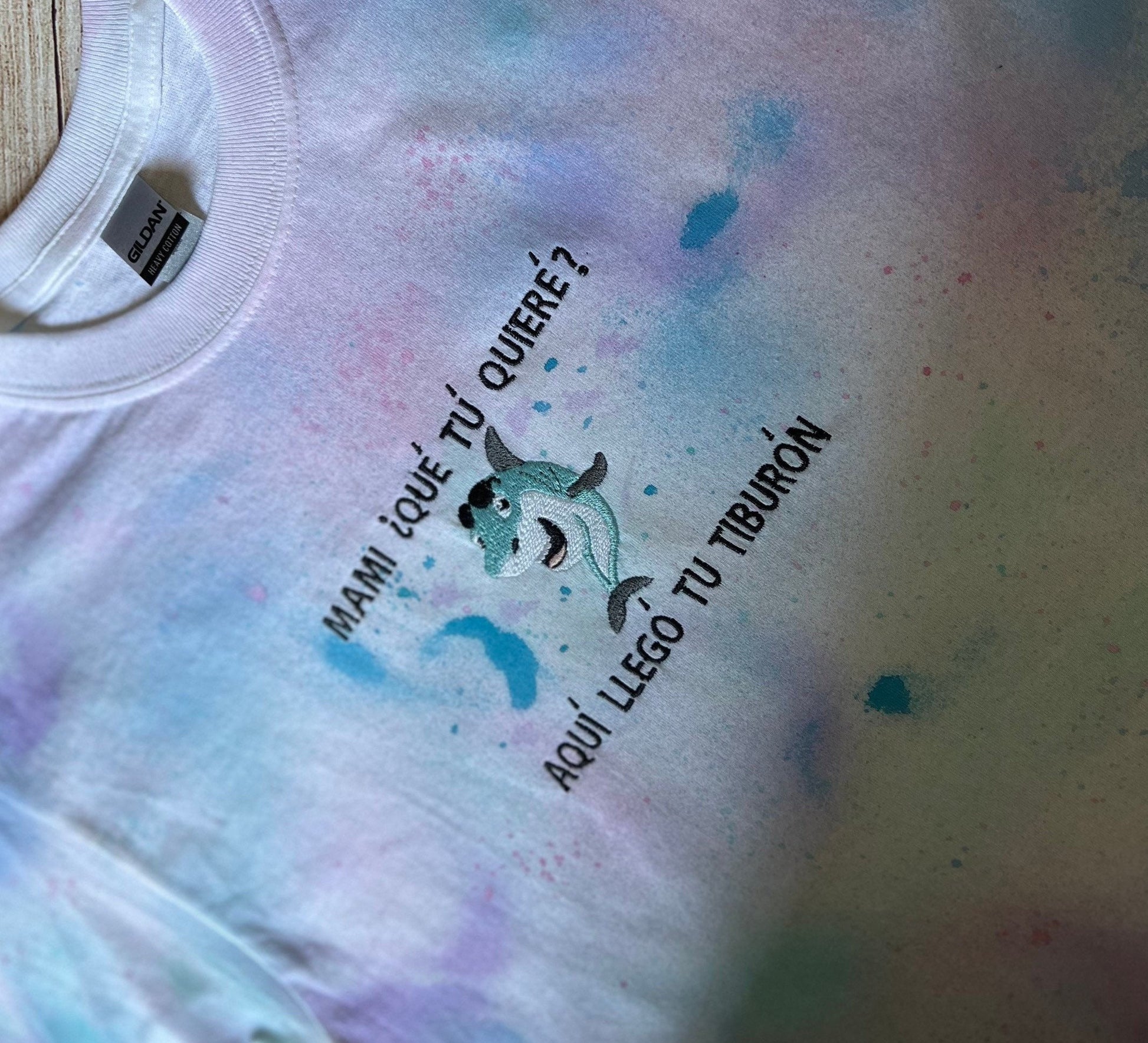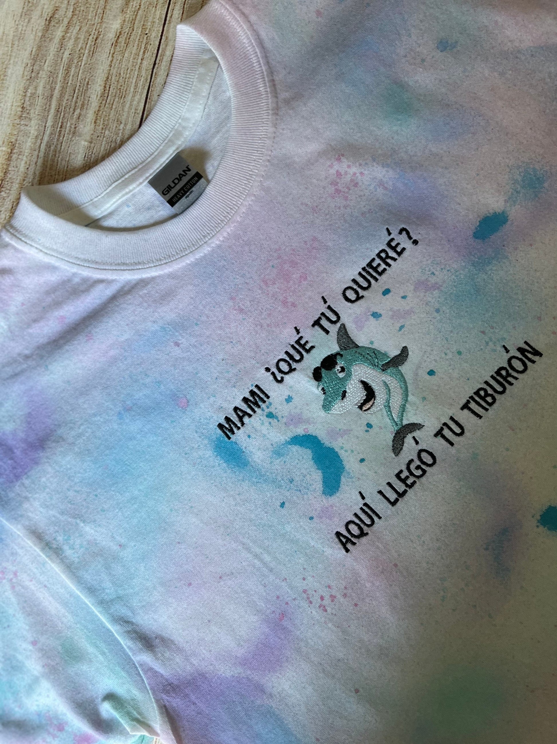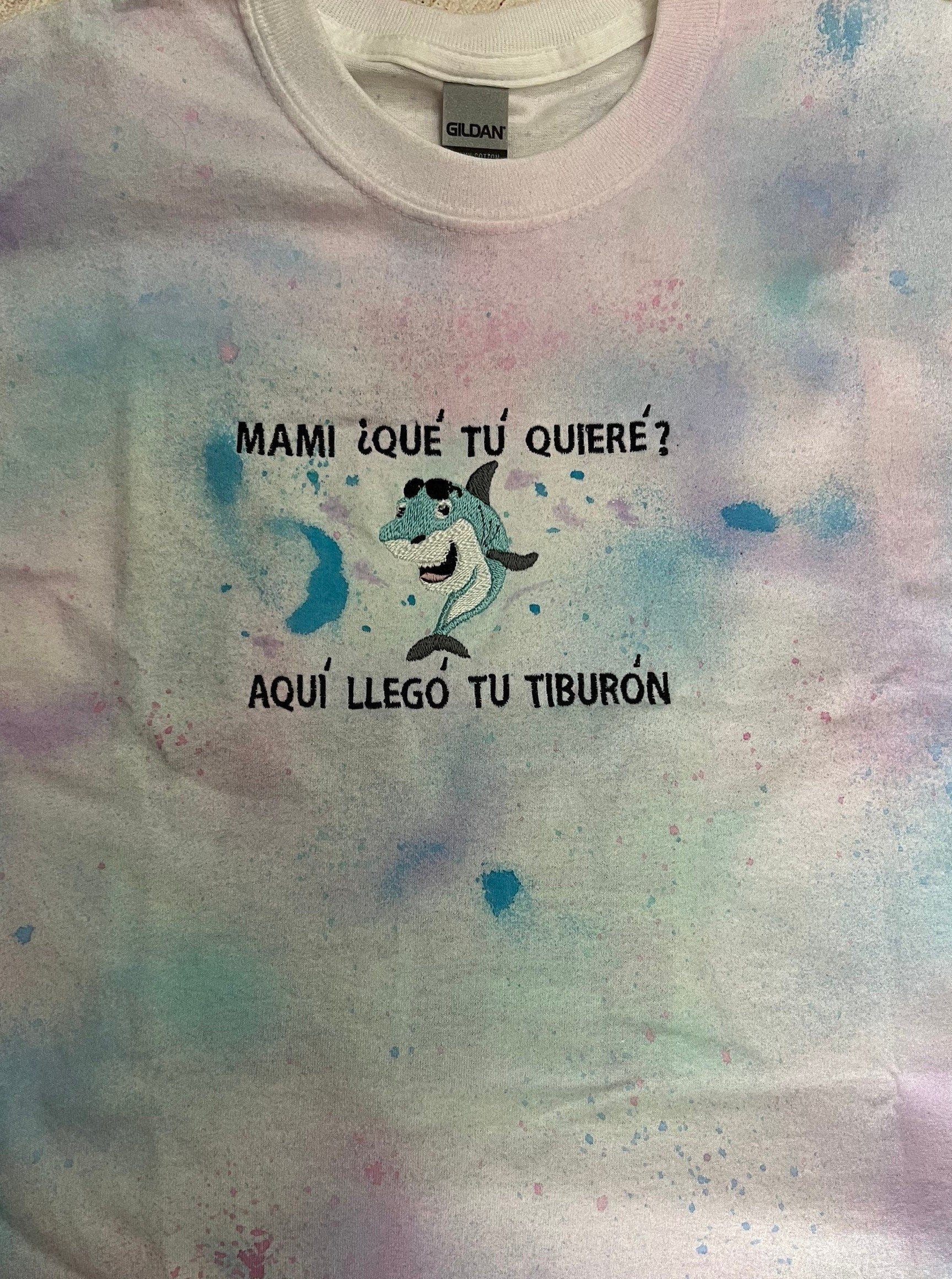 Bad Bunny Tiburon Embroidered multi colored T-shirt. Shades of pink, blue, turq, greens, Fuschia and purple cotton T-shirt. Made to order.