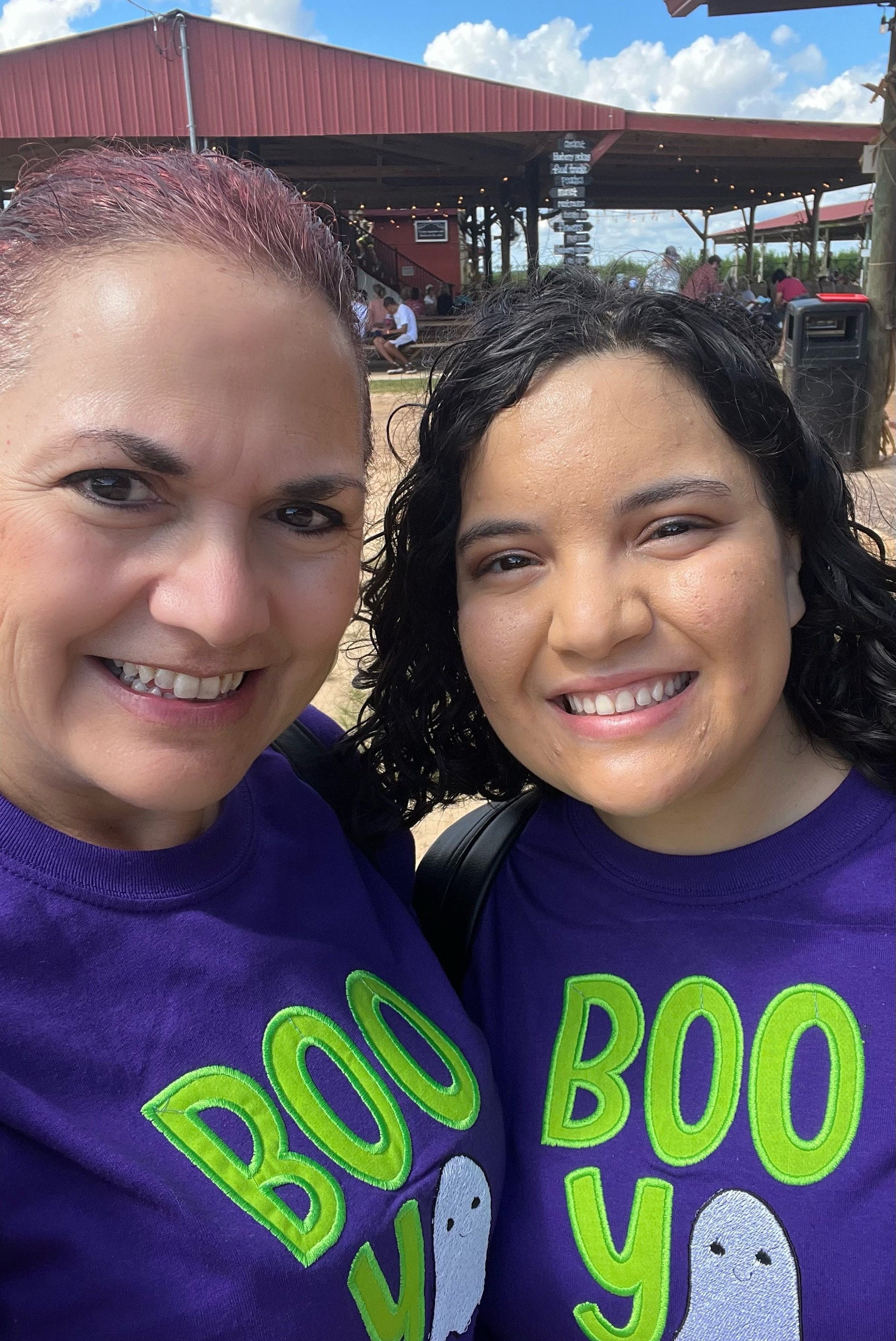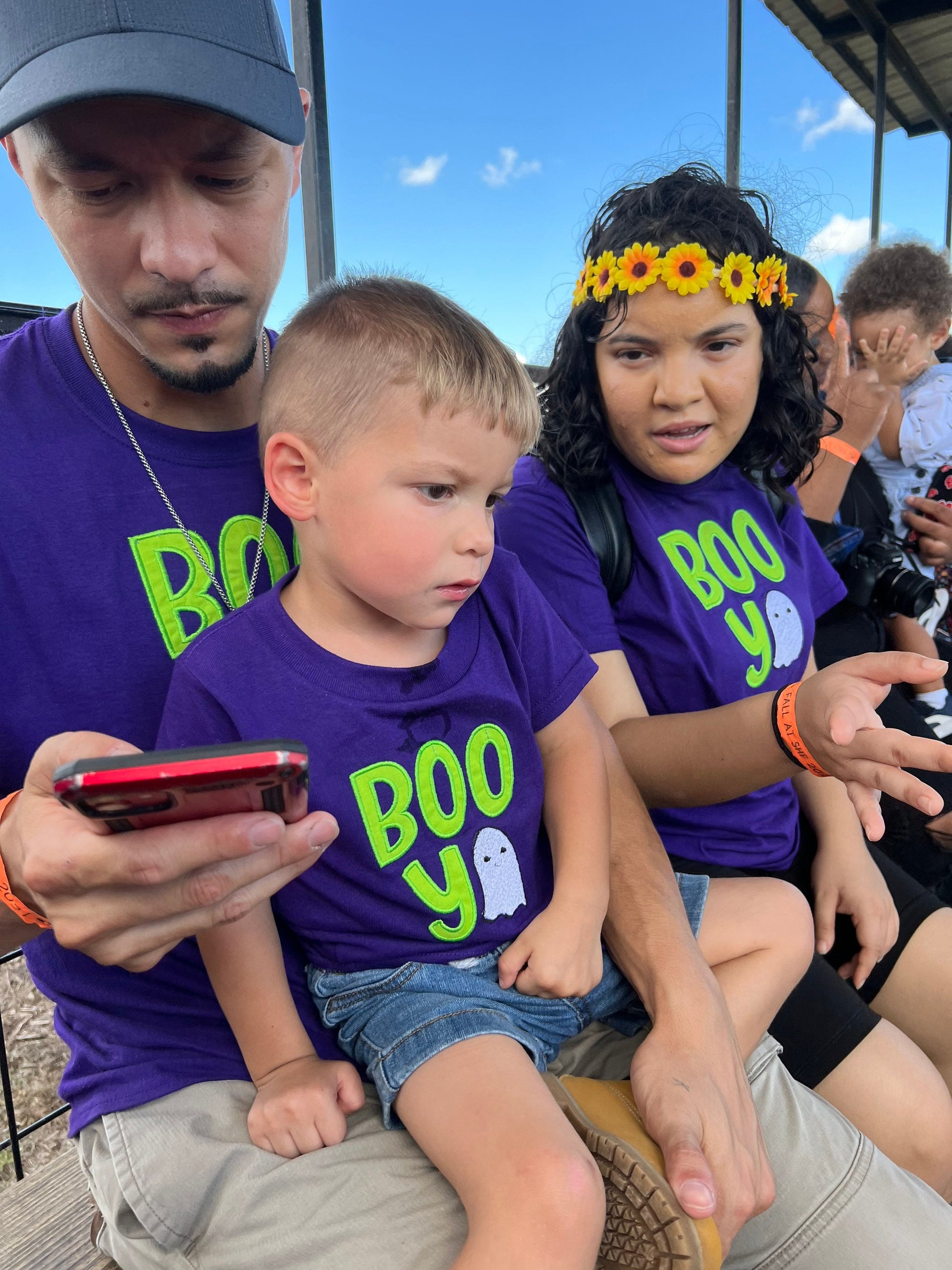 Boo Ya Kids Halloween Ghost Embroidered T-shirt. Perfect for the lil ones - not so scary for them but playful. Shown in purple.