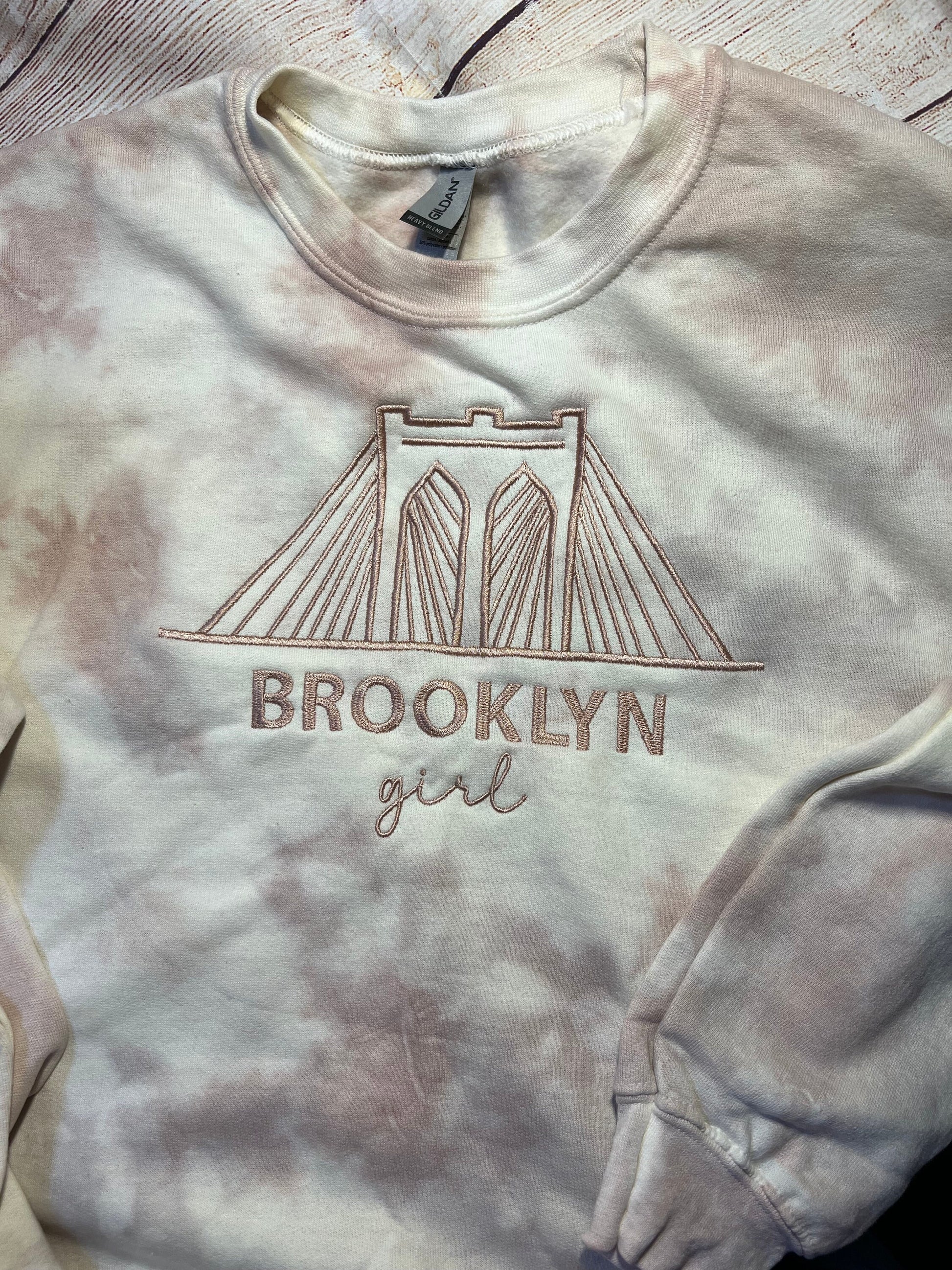 Brooklyn Bridge featured in this Brooklyn girl embroidered crewneck design. Tone on tone design featured in tie die look with warm tones of beige, cream and off white. Cotton long sleeve sweatshirt. Made to order and can customize any of the colors.
