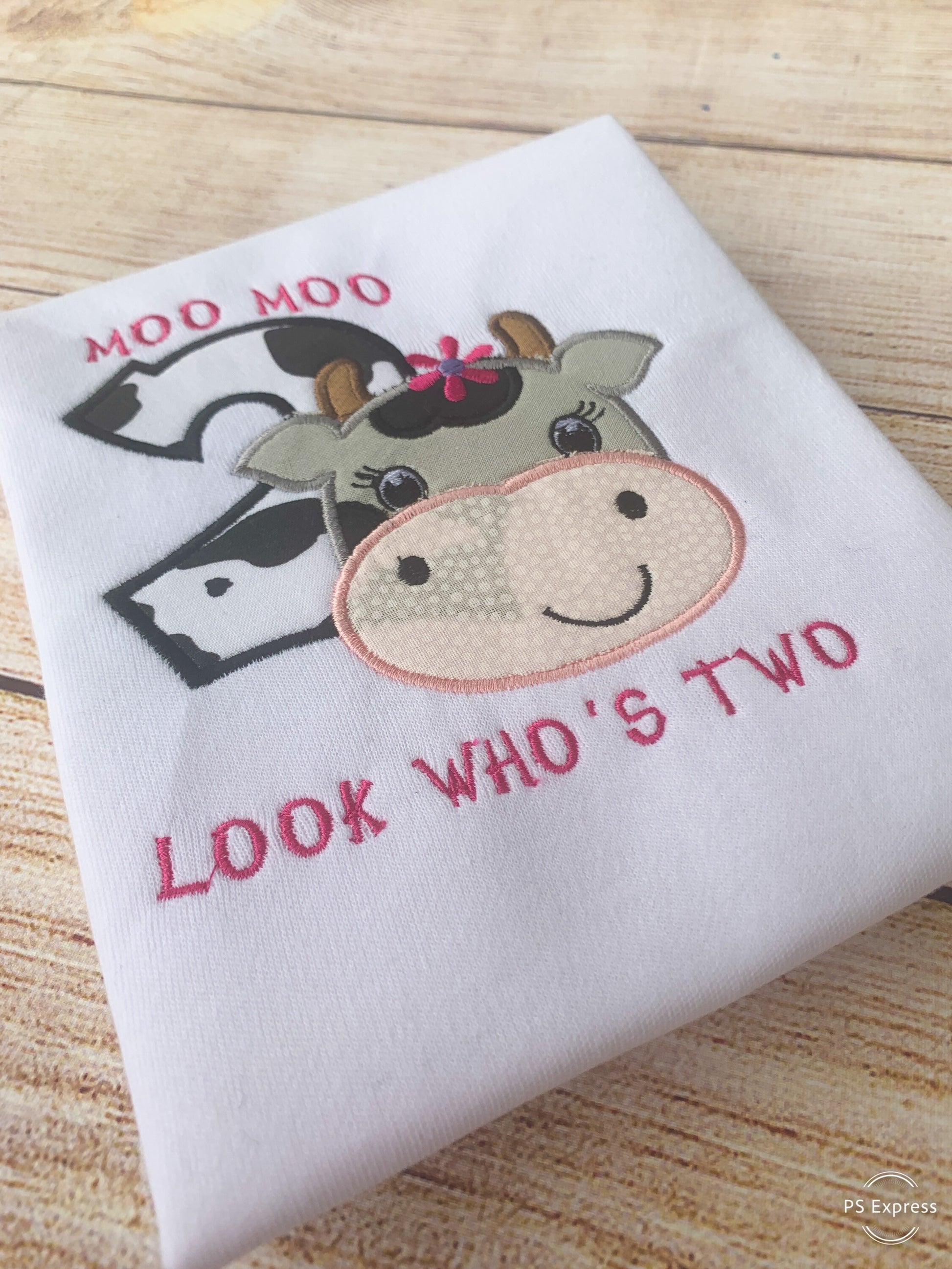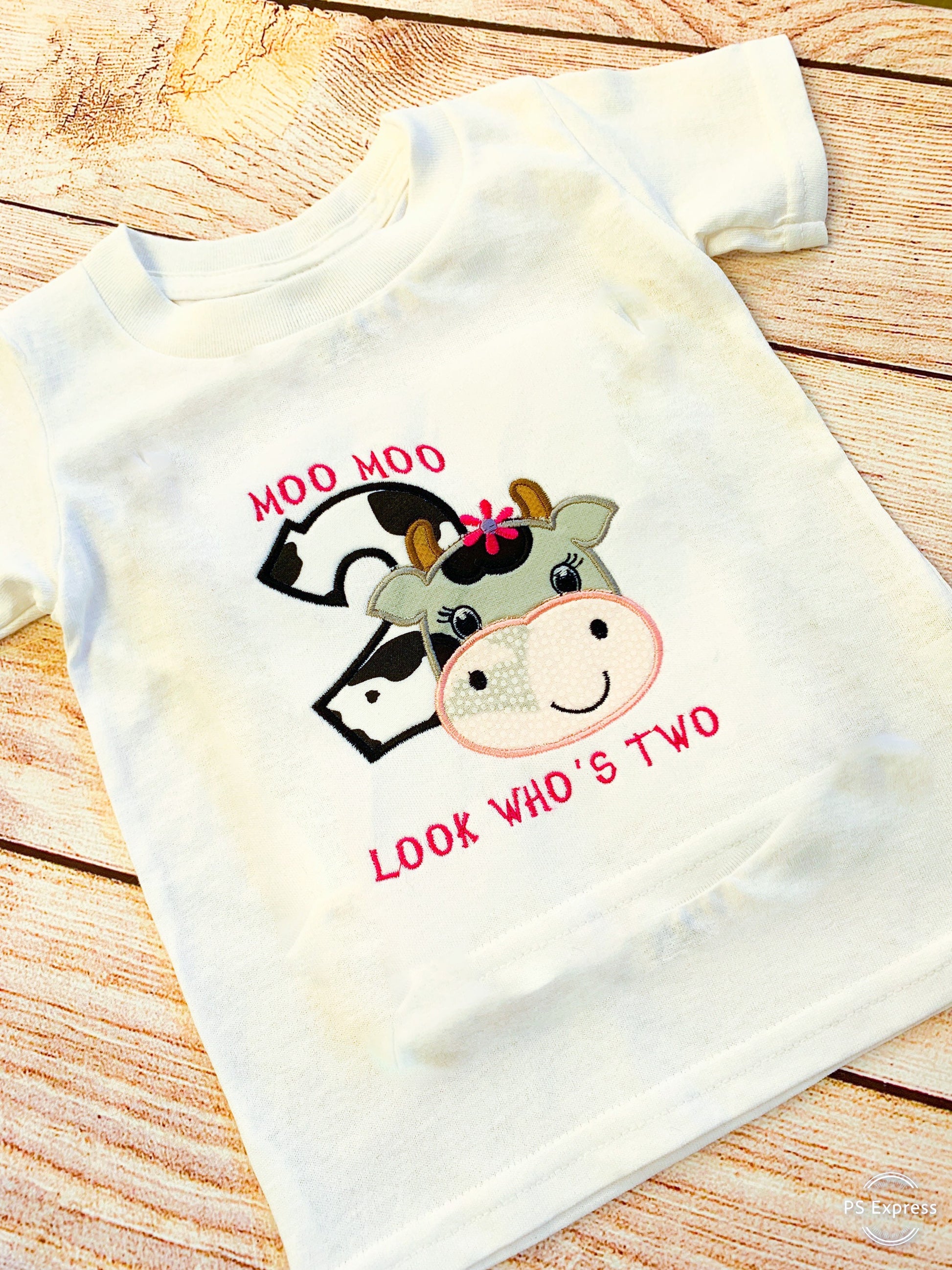 Cow Birthday Moo Moo look who’s Two farmT-shirt Embroidered custom T-shirt. Sizes available: