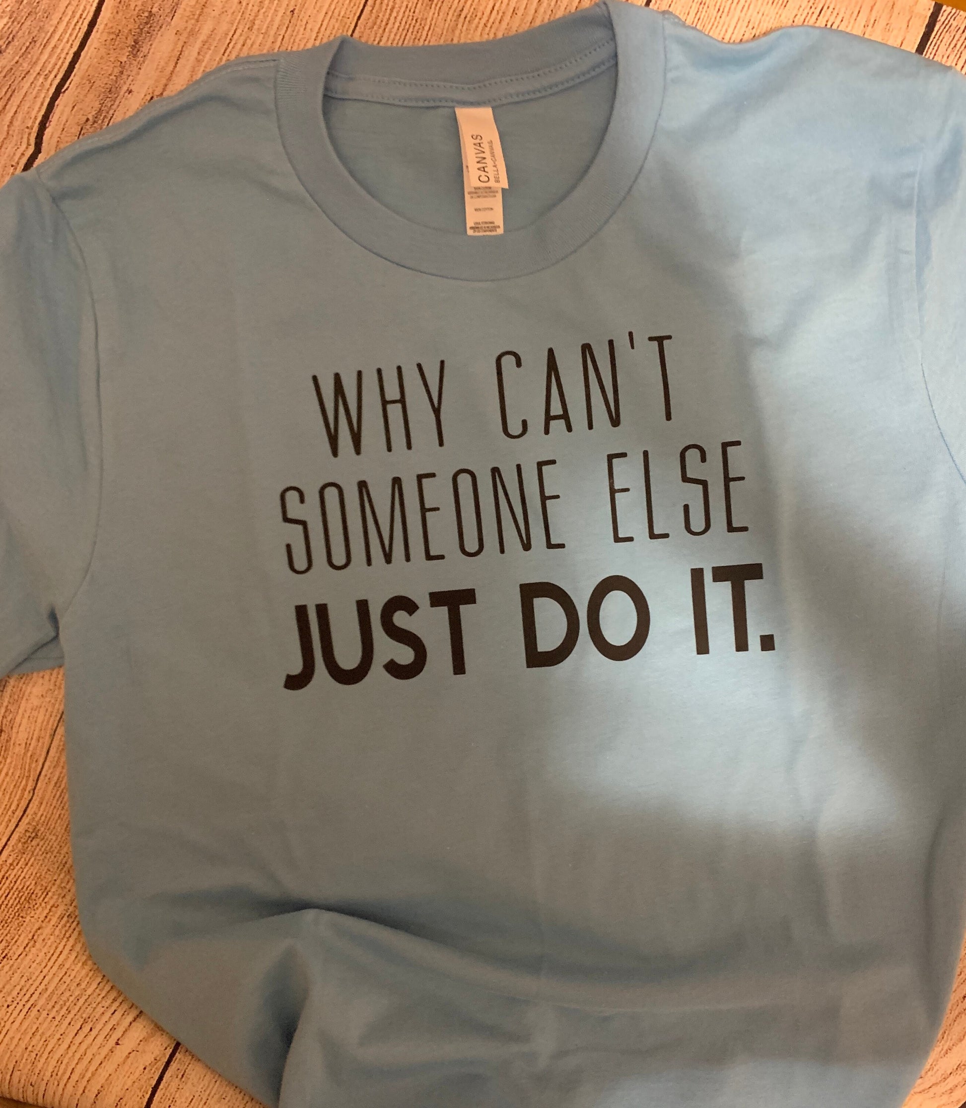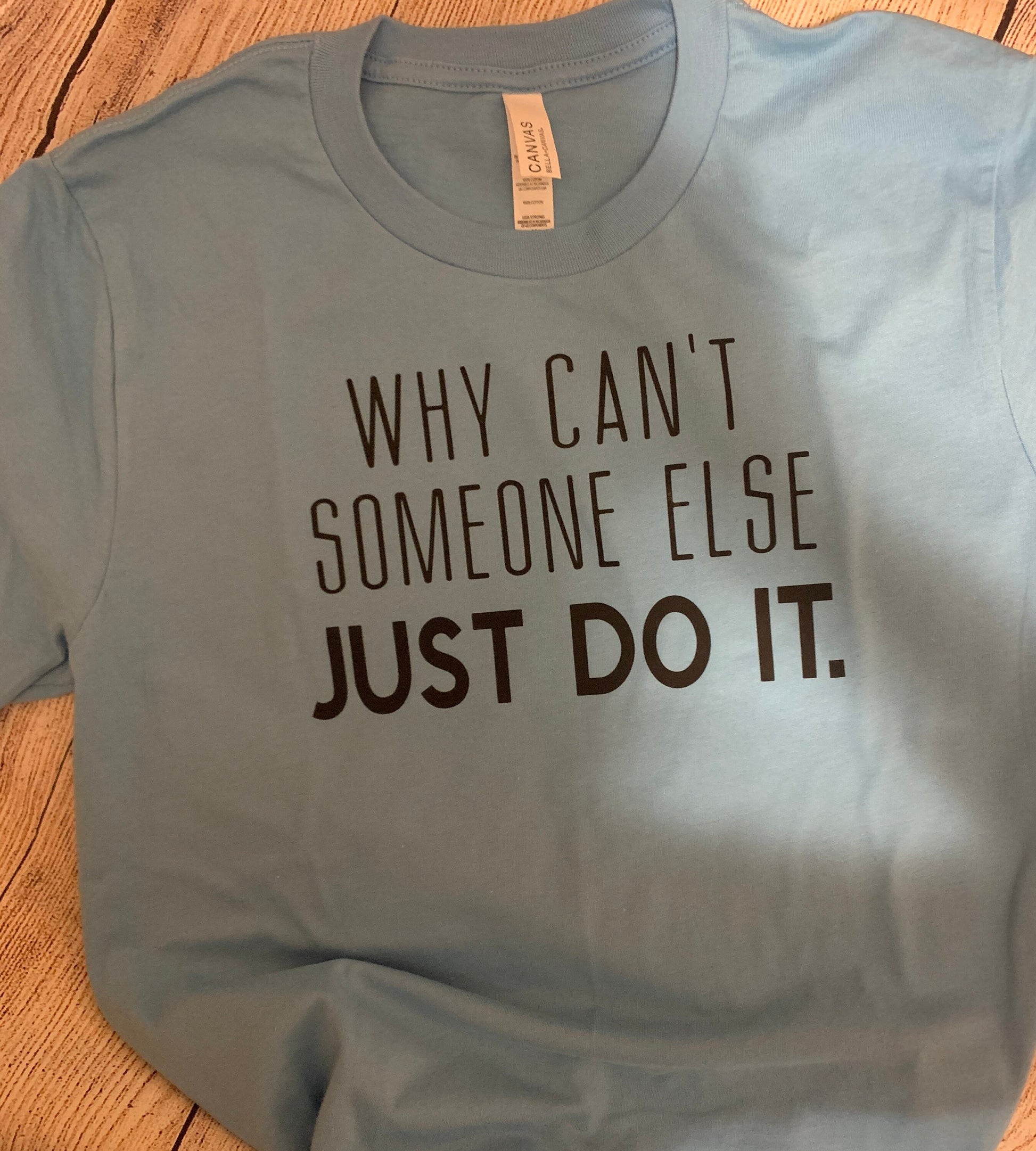 Why Can’t Someone Else -Just Do It T. Light Blue with Black Lettering. Sizes Small, Medium, Large, XLarge and XXLarge. Indicate your size in notes.