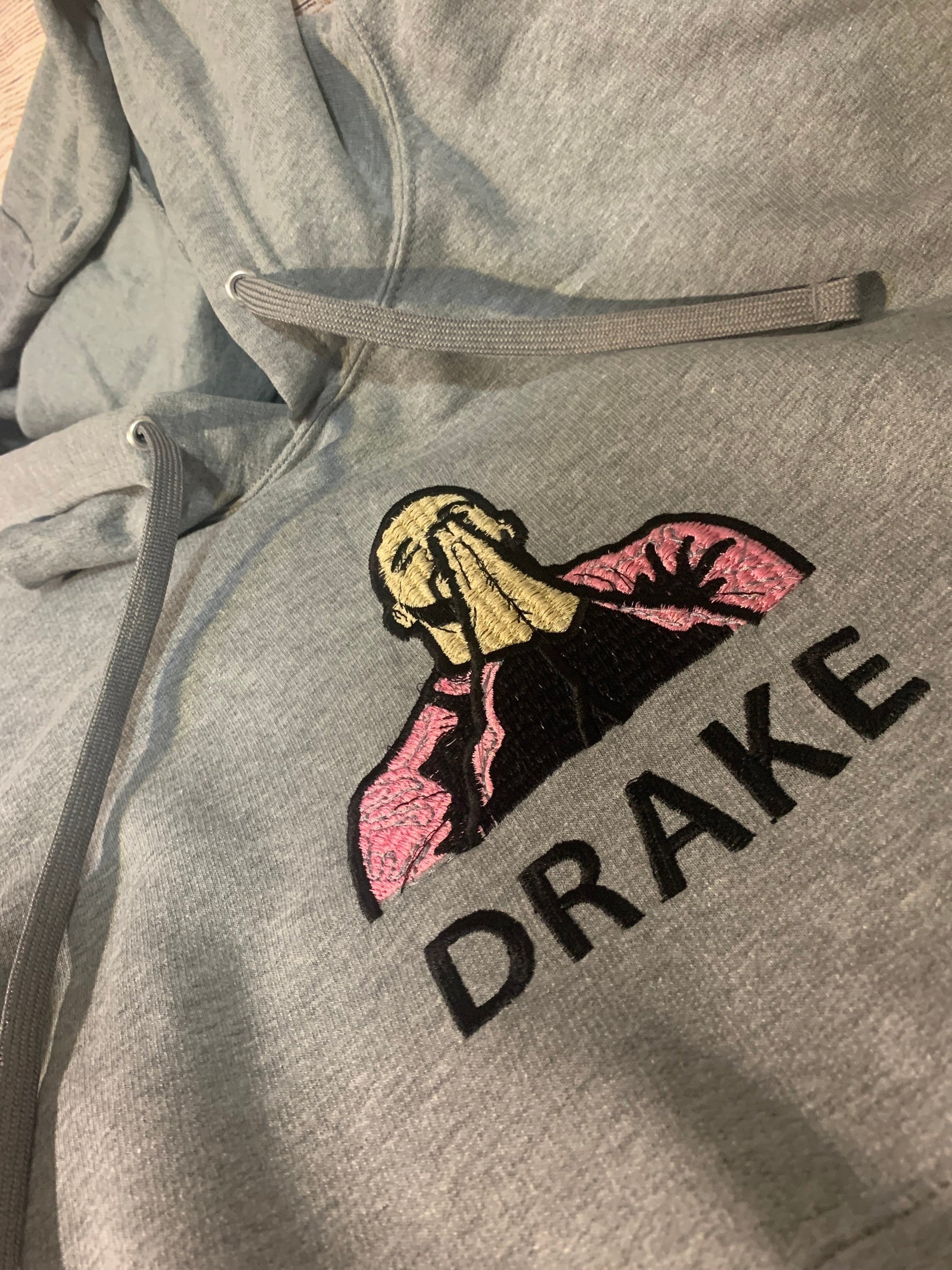 Drake embroidered hoodie. Long sleeve, grey, cotton hoodie. Made to order and can customize the color of Drake’s jacket.
