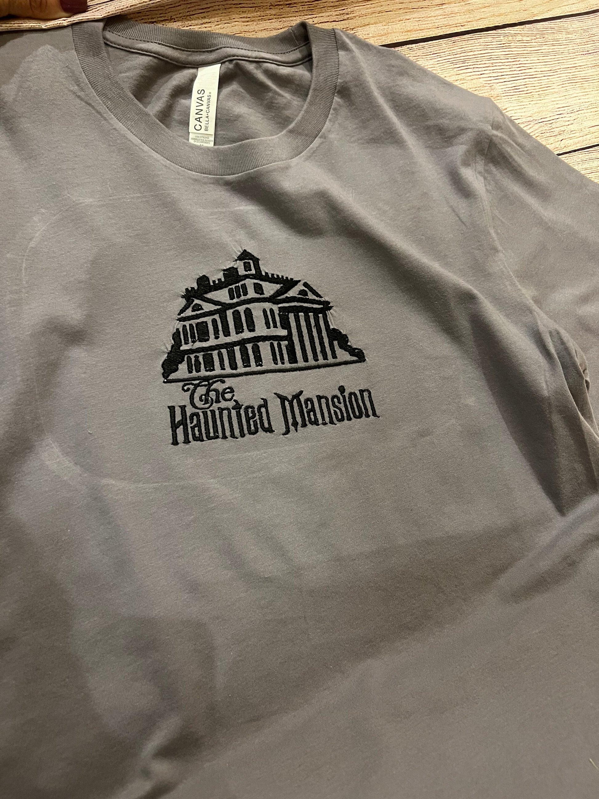 Embroidered Haunted Mansion T-shirt. The movie classic for Halloween.