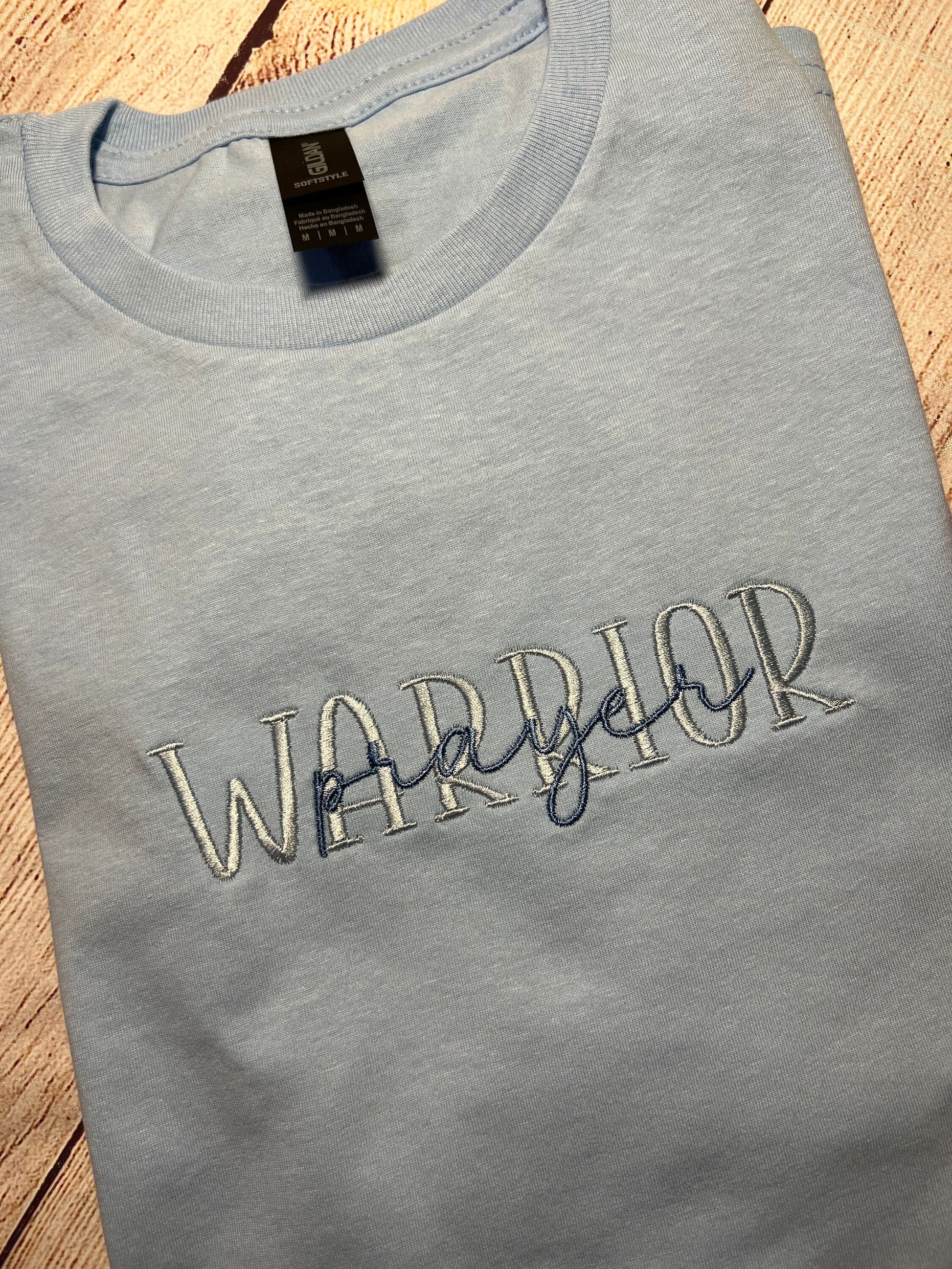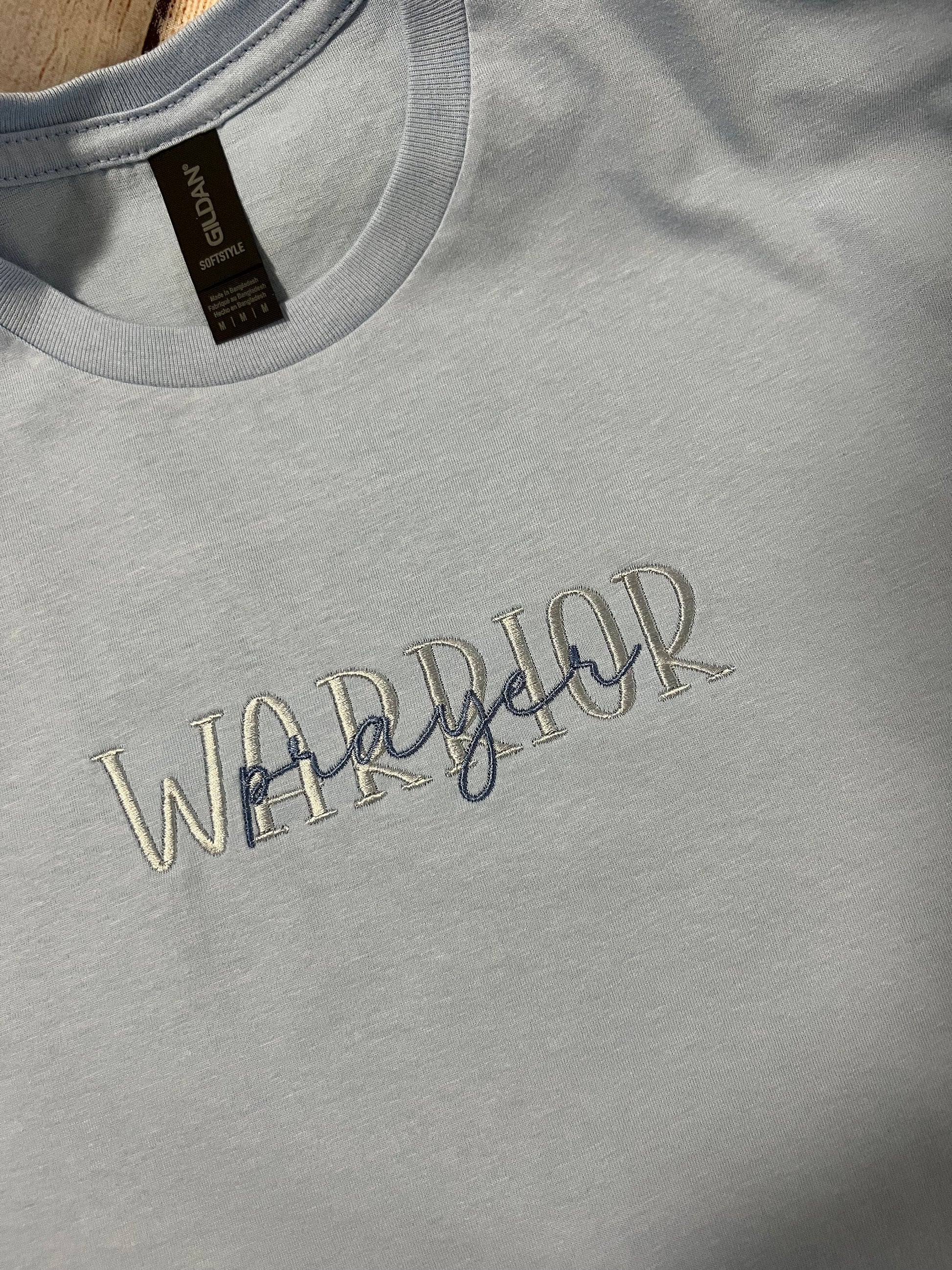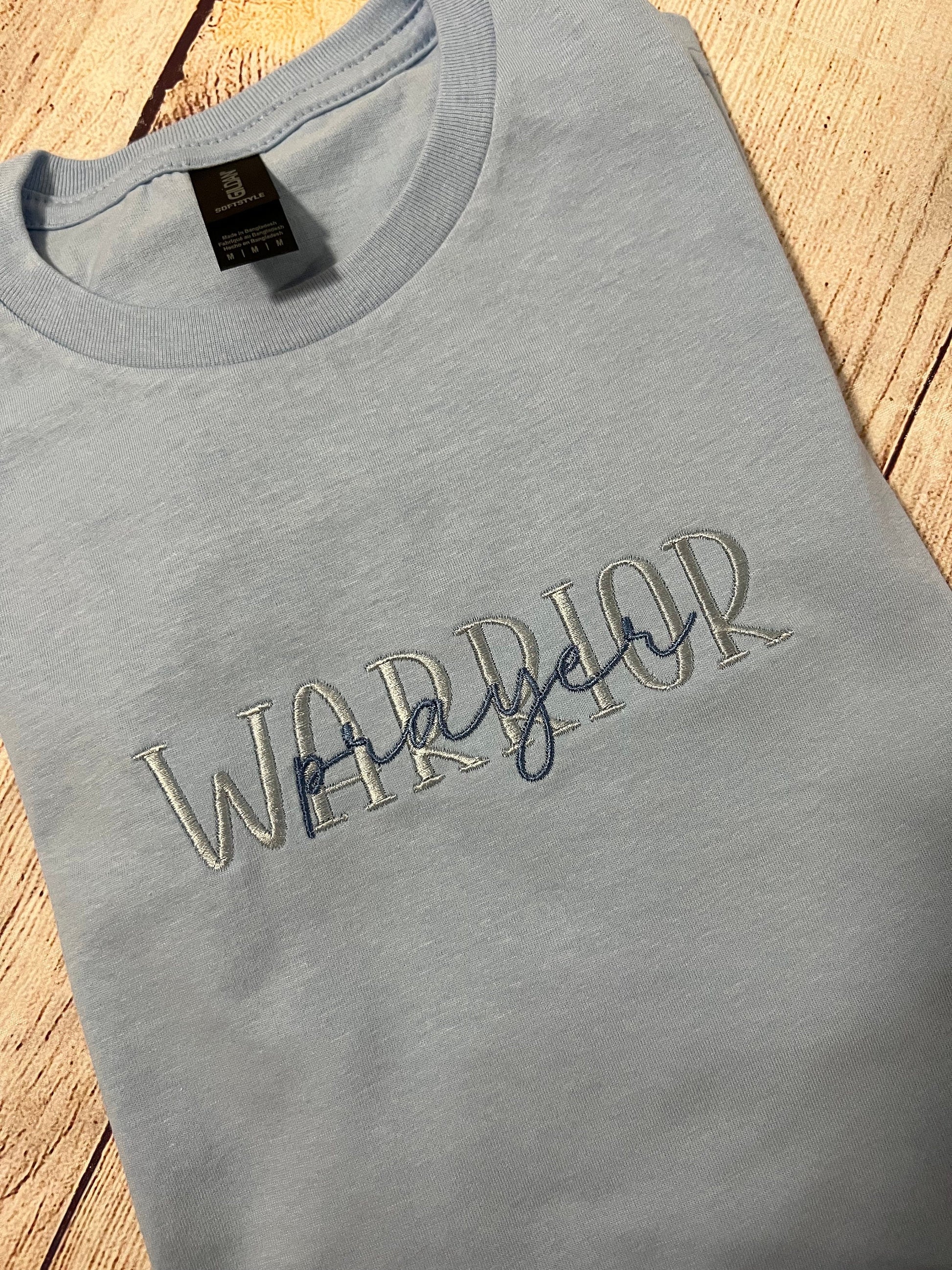 Prayer Warrior Embroidered T-shirt. Light Blue T with suttle light blue thread saying WARRIOR. Show who you are and that prayer is important to you and a part of your life...