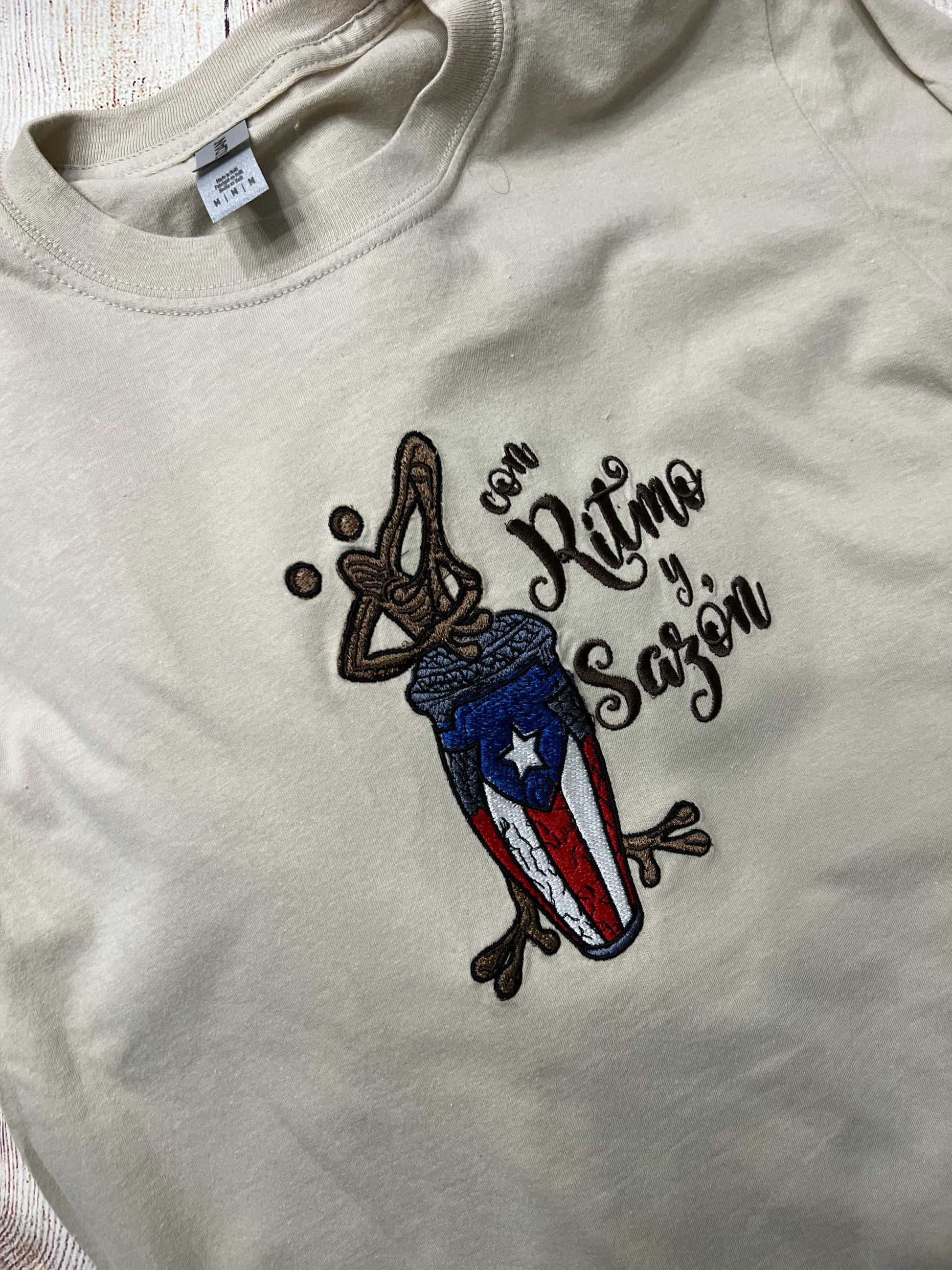 Ritmo and Sazón Boricua T-shirt. Fully embroidered design. Show your pride. Perfect gift or keep for yourself.