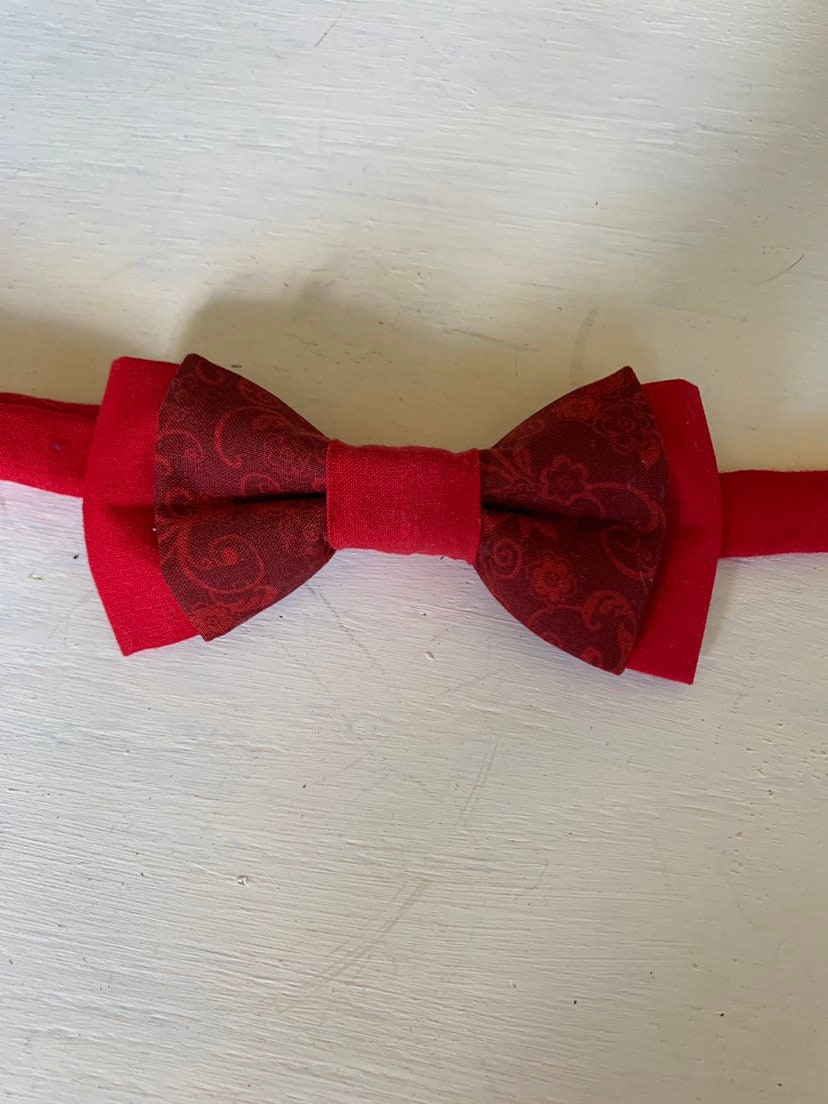 Standard size bow tie with adjustable neck strap with front bow being offset