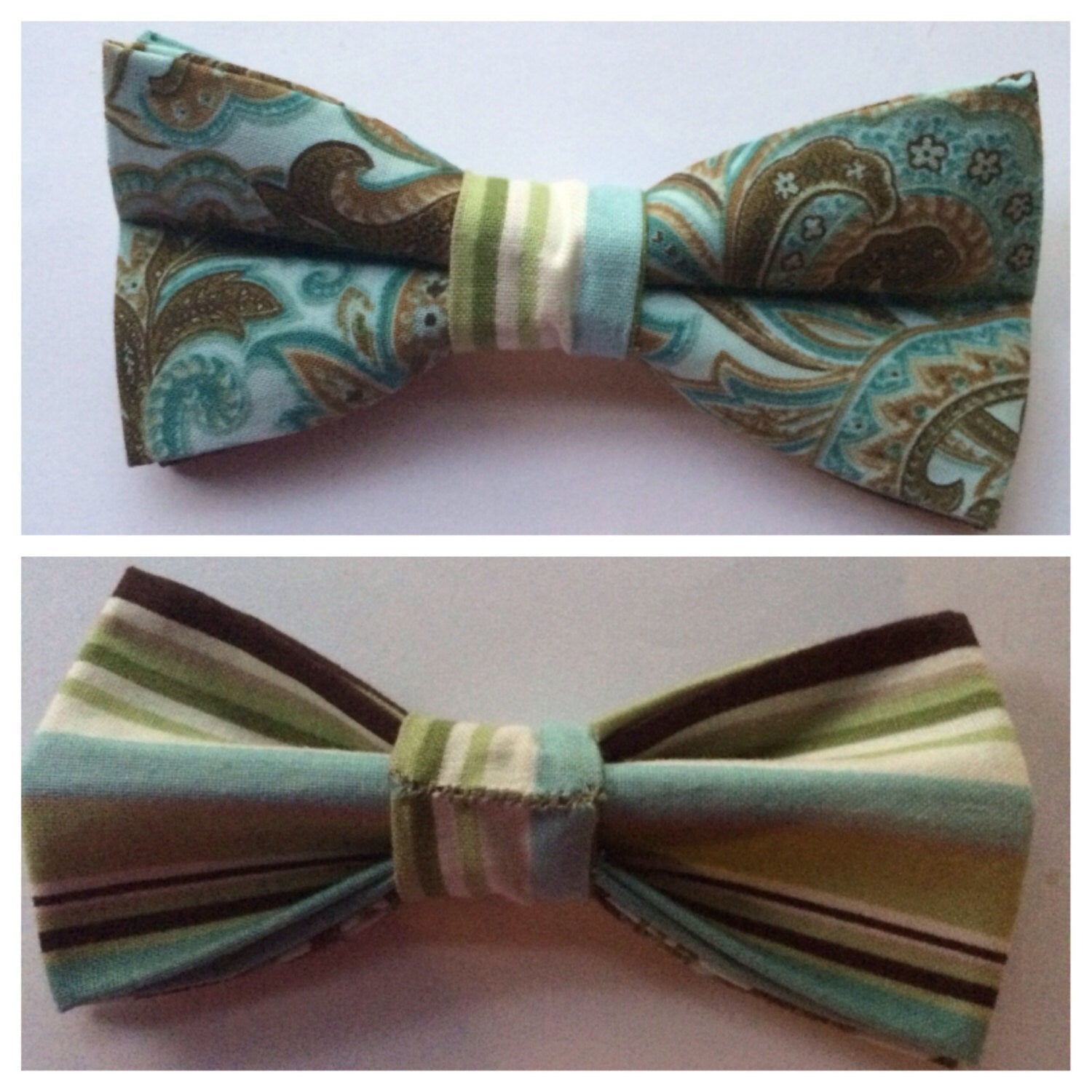 Stripes with Paisley in cool tones of teal, brown, blue and green. Cotton with adjustable neck strap.