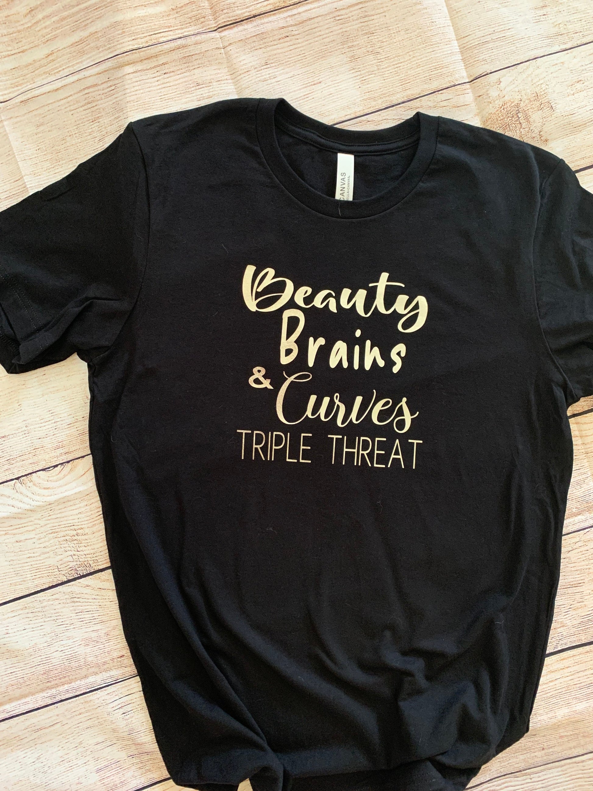 Triple Threat T. Beauty Brains & Curves. Embrace your femininity. Black T with metallic silver letters. Sizes Small, Medium, Large, XLarge and XXLarge. Please indicate in notes your size.